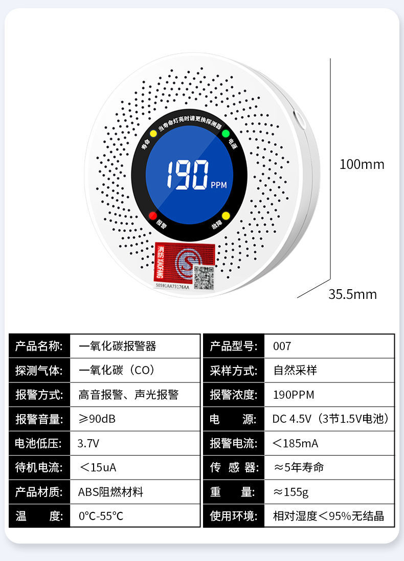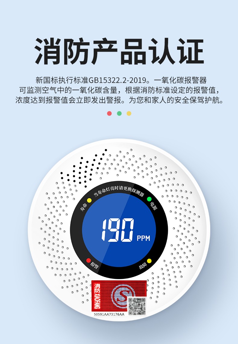 一氧化碳報警器(型號PA-008) 產品規格 功能特點 資料下載 一氧化碳報警器(型號PA-008)檢測氣體、燒煤、燒柴、燒炭、蜂窩媒、露營封閉環境、封閉車內85分貝報警音量.LED液晶屏幕顯示故障自檢: 綠燈(正常)、黃燈 (故障、需要檢修) 紅燈(氣體濃度超標) 5.報警方式:蜂鳴聲提示 6. 產品保險:1000萬承險 7. ABS阻燃材質適用場景:適用于廚房、浴室、起居室、火鍋包廂、飯堂等長時間空氣不流通的場所安裝一氧化碳報警探測器